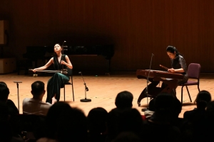 音乐会曲目遴选了五部与闵惠芬艺术生涯紧密相连的作品,在主持人萧梅教授娓娓道来的导赏中,这五部作品仿佛五枚钥匙,依次打开了通往大师精神世界的大门。开场一曲《江河水》,哀婉深沉,瞬间将观众带入闵惠芬最具代表性的艺术境界。这首由黄海怀移植的经典,在闵惠芬的弓下曾被诠释为“鞭挞黑暗的音乐檄文”。陆轶文与扬琴演奏家曹蕴的合作,气息合一,神韵贯通。作品中“压揉”技法和北方风格的“回滑音”是闵惠芬从管子演奏家谷新善那里琢磨而来,让悲愤的控诉中始终透着坚韧。曹蕴老师作为长期伴随闵惠芬演出的老搭档,以扬琴音色精巧点缀,紧密配合着陆轶文的演奏。舞台上,曹蕴望向陆轶文那认真的眼神仿佛穿越了时空,令人恍然动容。