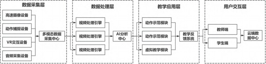 基于多维视频采集技术搭建二胡演奏技法可视化教学系统,通过高速摄像设备全方位捕捉演奏动作细节,利用动作捕捉技术将演奏姿态转化为三维数字模型。如图1所示,该系统整合多维视频采集与动作捕捉以及VR交互等核心模块,通过人工智能分析引擎实现动作分析与示范教学以及对比纠错功能,系统设置不同机位摄像头实时记录左右手指法运弓动作,配备智能体感设备采集演奏者身体姿态数据[4]。结合人工智能算法对演奏动作进行自动分析识别,生成规范化示范动作模型,教师可在系统中标注动作要领,添加技术要点讲解,制作微课视频资源,系统支持动作对比分析功能,帮助学生发现与示范动作间的差异,实现精准纠错。针对二胡基本演奏技法如顿弓与跳弓以及滑音与揉弦等技巧,系统设置分解动作教学单元,通过多机位