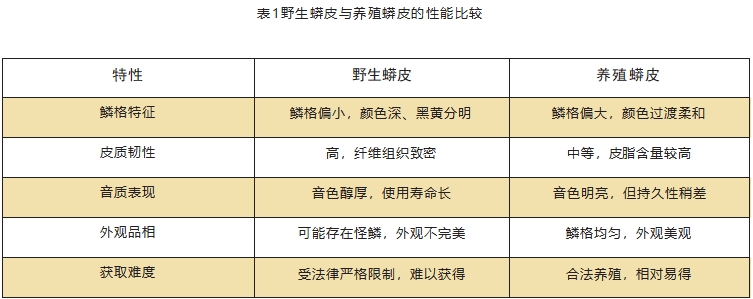 随着环保意识的提升和野生动物保护法规的完善,蟒皮来源发生了显著变化。传统使用的野生蟒皮因其在自然环境中生长,运动量大且饮食不规律,皮质表现出鳞格偏小、颜色深、黑黄分明、油性高的特点,具有优异的韧性和长久的使用寿命。而现代普遍采用的人工养殖蟒皮虽然在外观品相上(鳞格大而均匀)更受消费者青睐,但由于饲养环境优越、运动量不足,其皮脂含量高,纤维组织相对疏松,在音质表现和使用寿命上略逊于野生蟒皮。