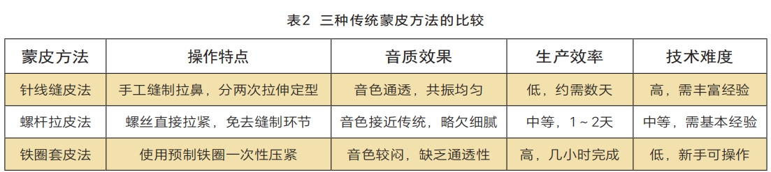 相比之下,“铁圈套皮法”(也称钢圈蒙皮法)则更具工业化特征,利用特制铁圈套在琴皮外边,通过螺丝杆收紧,依靠铁圈斜边的压力拉紧皮膜。这种方法操作简便,适合批量生产,但对音质的把控不如前两种方法精细。