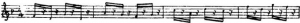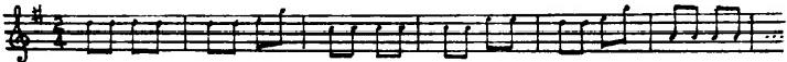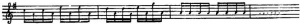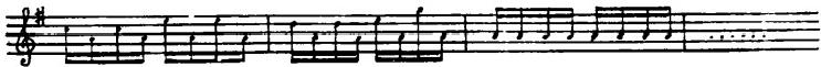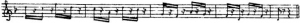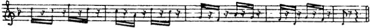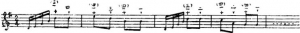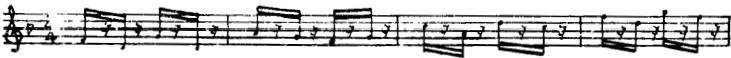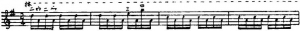 这是听觉留下的谱例,前面是演奏谱例,听觉谱与演奏谱之间的差距是靠接弓技法来填补的,这就是前面讲的实音与浮音的缘故。这似明非明的衬音加上主调交替出现时所产生的混响不正是使我们脑子里出现人呼马啸,飞沙走石啬乐形象的“显影剂”吗?试设怒,用别的技法来演奏这旋律,无疑将会大为逊色。