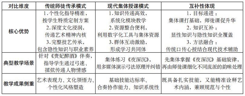 教学内容上,师徒传承擅长传递“隐性知识”(如演奏韵味、舞台感觉),集体授课擅长讲授“显性知识”(如乐理、弓法规范),二者结合可实现知识体系完整覆盖。教学方法上,“口传心授”与“技术辅助”(如录音分析、视频纠错)互补,既保留传统精髓,又提高教学精准度。(见下表)