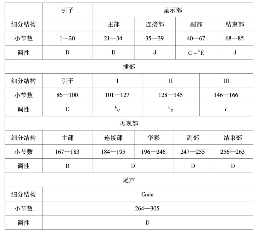 李博禅在《楚颂》中设计了两个性格呈现对比的“英雄”主题(21—34小节)与“爱情”主题(40—67小节),它们不但呈现关系大调上的属调关系,而且主题内部的调式也有着人物形象的考量:霸王的“英雄”主题采用更气势恢宏、庄严典雅的“雅乐”调式,虞姬的“爱情”主题则采用柔美隽秀、清新雅致的“清乐”调式,同时两个主题也契合了奏鸣曲式的两个主题要素。以下是对《楚颂》作品结构的图示: