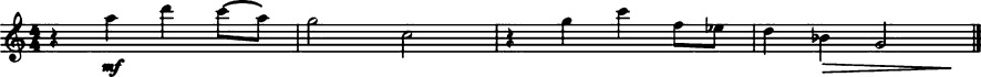 “英雄”的主题(谱例3)为d羽雅乐七声调式,在前六小节以主持续音烘托出沉重单调的“英雄”主题前半句(21—26小节)。演奏时,左手采用持续而密集的滚压式揉弦,结合右手平稳、扎实的运弓,所形成的极具二胡演奏魅力的饱满、浑厚音色,生动刻画出“英雄”主题形象。特别是在21小节、25小节处(谱例3),装饰音d与长音e的前后衔接,右手运弓应时刻关注弓毛与琴弦是否紧密贴合,同时还需注重弓速、弓段、弓压的默契配合。之后乐队进入的和声进行借用了来自关系大调F大调中明亮的S-T的进行,二胡“英雄”主题旋律的谱写,由前半句(21—26小节)的级进方式,逐步发展为三次七度的跳进。因此,演奏者在旋律跳进的过程中,为保证左手在琴弦上进行大跳时音准的把控能力,大脑需要先对左手在琴弦上的跳把距离进行预判,再运用双眼余光进行辅助,以此高质量完成演奏。随后回到柔和、深沉的d小调中(s9-d7-t),其中小属和弦的使用(31—32小节)是考虑了契合中国风格的民族调式处理,淡化尖锐的导音至主音进行,同时也弱化了和声解决中的紧张,为音乐赋予了一层东方柔情之美。诚然,跟随此处音乐手法的丰富变化,演奏时,二胡音色也逐渐明亮起来,右手弓压的控制较之前更为放松,左手揉弦较之前更为柔美,演奏者音乐情绪也正在悄然转变,整体演奏给人以意犹未尽之韵味。与此同时,主题开始时d音在低音提琴声部的持续,用简练的手法展现出霸王严肃、深沉的情绪与性格特质,也增加了故事的悲情基调,为后续“爱情”副题埋下伏笔,音乐形象上的鲜明对比,更加衬托出作品“交响音画”的特色。作曲家在选择了如此伴奏的形式,配合上主题中三次七度的跳进,仿佛是在雕刻出“英雄”身上铠甲的线条,便撑起了一个生动、尖锐的“霸王”气势和形象。