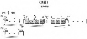 幻想叙事曲《鸿雁》的曲式结构为单乐章变奏曲式——运用了民族五声、七声调式,又分别在角(mi)、商(re)、徴(sol)、羽(la)四调式中交替变换发展。引子段在徐缓悠长的羽音la长低音上结束。