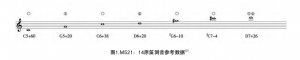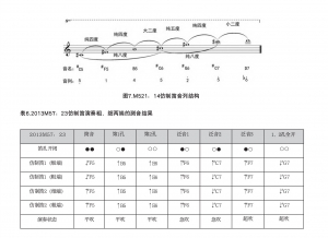 从图7仿制笛的音列结构可以看出,M521:14仿制笛的音列结构为:纯四度、纯四度、大二度、纯五度、纯四度、小二度。在筒音和两个笛孔间连续构成纯四度(—1—4);在筒音和倍音列的三个泛音间分别构成:纯八度(—5)、纯五度(5—)、纯四度(—)。