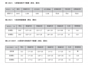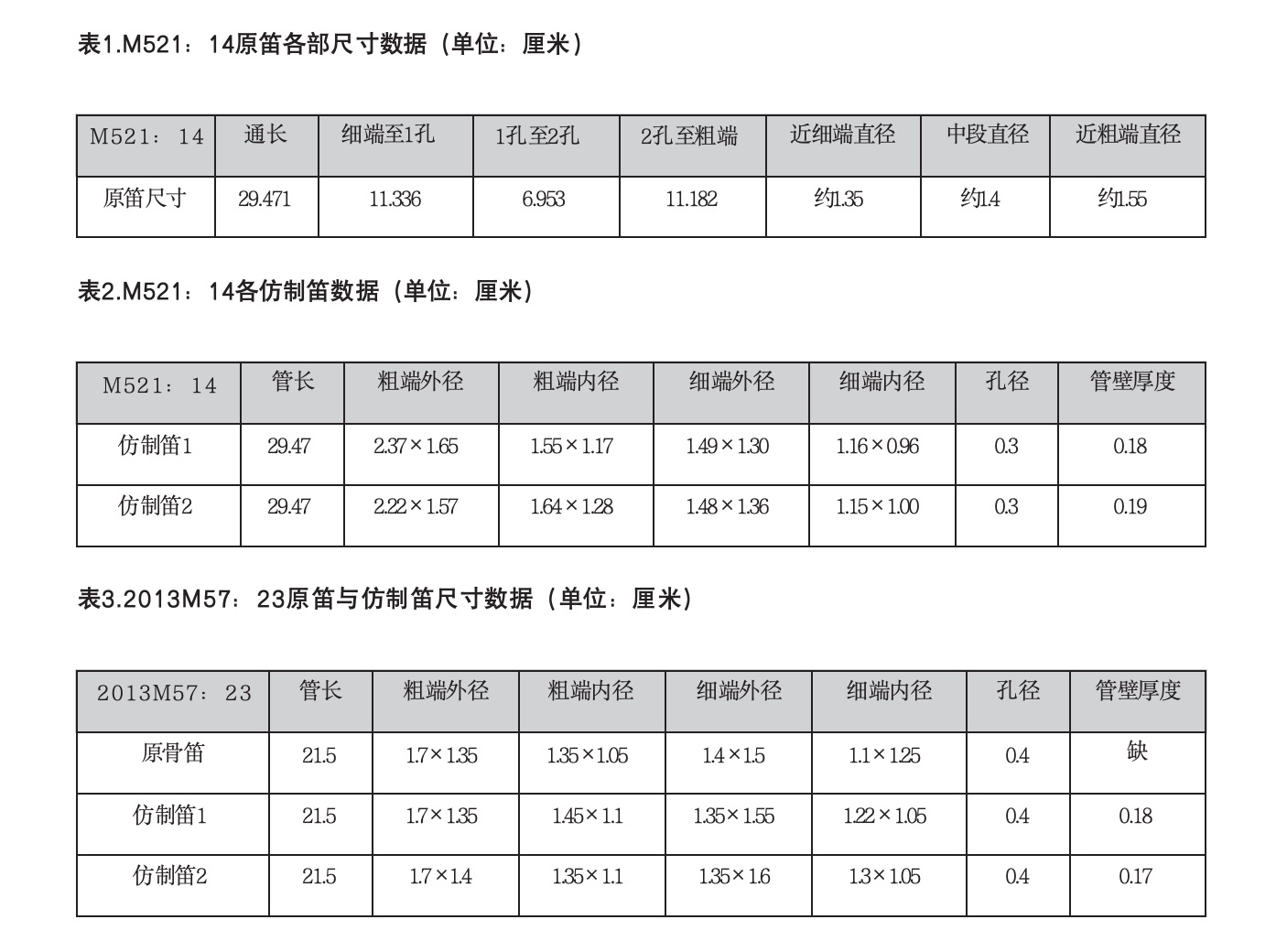 线图中附带的骨笛管长、管径、笛孔间距等数据较为详尽,笔者根据这些数据选取2支相近尺寸的骨质材料进行仿制,原骨笛与仿制笛1、仿制笛2详细尺寸数据见表3。