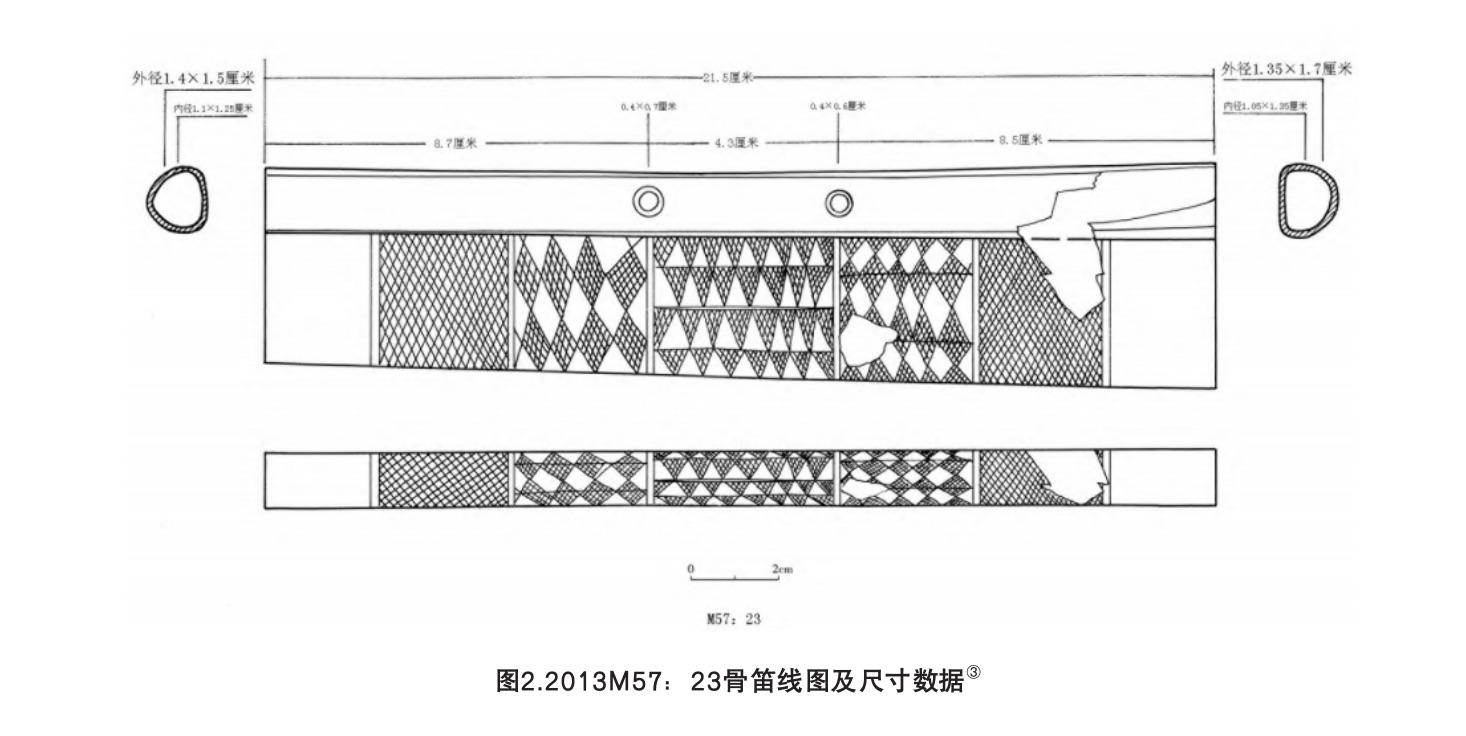 14骨笛相同。M521:14骨笛的第二组和第四组纹饰均为长方形,每组4个;相比之下,2013M57:23的第二组和第四组纹饰为大菱形,中间还雕刻有细密的小菱形纹。特别值得注意的是,靠近管口细端的一组纹饰为4个大菱形,而靠近管口粗端的一组则是5个菱形纹。关于两支二孔骨笛的纹饰图案及功用,尚待学界进一步研究。