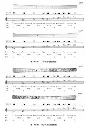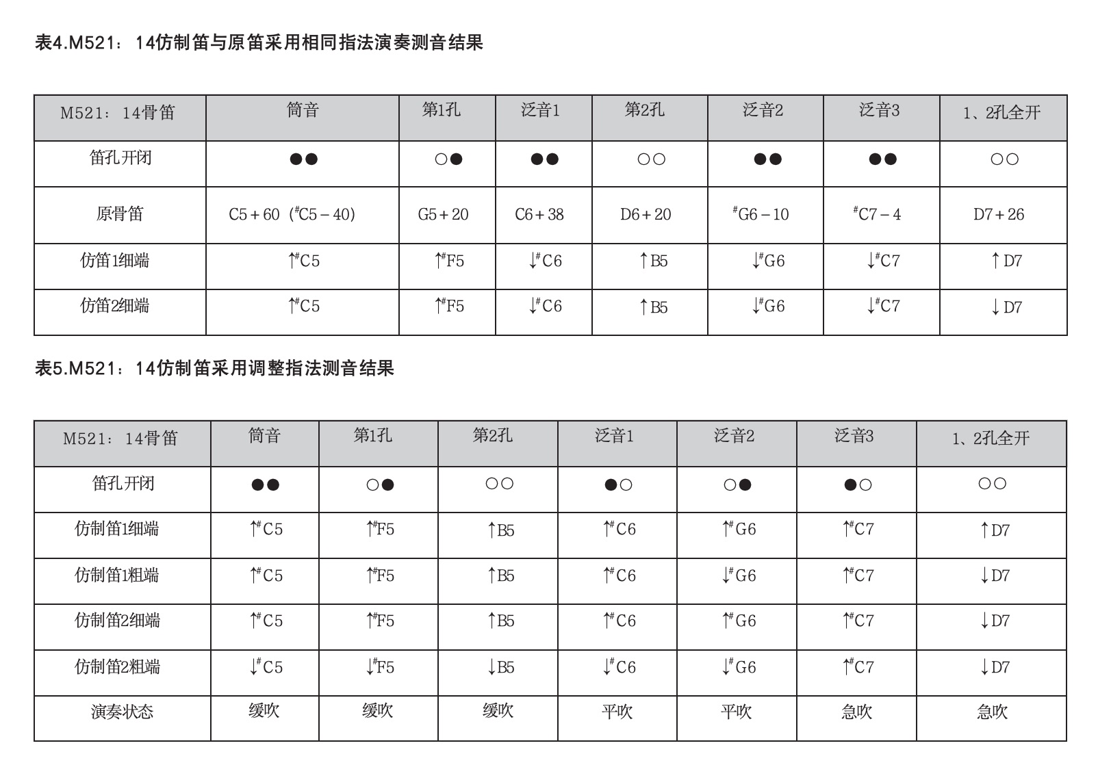 通过对上述各仿制笛测音结果分析,可以发现M521:14仿制笛的测音数据与原笛有所不同,尤其表现在第1、2孔音及泛音1音高。由于该骨笛的测音