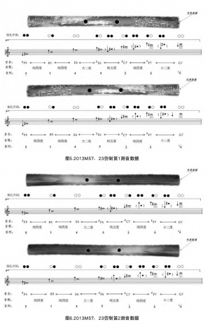 需要说明的是,笔者在对2013M57:23仿制笛吹奏测音时仍然运用了两种不同的指法,尤其在演奏倍音列各泛音时,如果仍以全按孔的方式进行演奏获得的各泛音仍然存在音高与音程关系失调的问题,所以需要通过开闭两个笛孔作为辅助,以获得较为准确的泛音列音高。从2013M57:23仿制笛的音列结构分析,仿制笛演奏粗、细两端均能获得一致的音列结构:纯四度、纯四度、大二度、纯五度、纯四度、小二度。这与M521:14仿制笛的音列结构也完全一致,只是2013M57:23仿制笛的筒音位置比M521:14仿制笛的筒音移高了纯四度,前者筒音为#F5,后者筒音为#C5。这样的结果与两支二孔骨笛的管长及其笛孔数据比例相吻合。