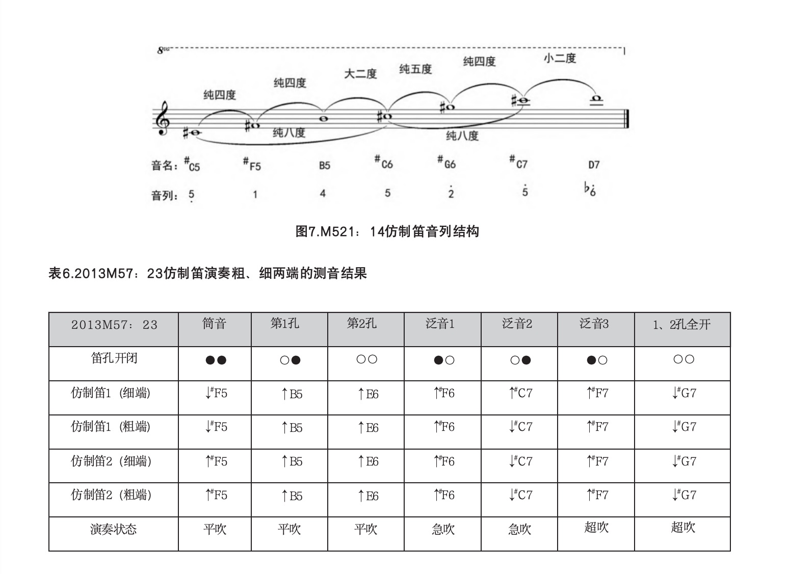 关于2013M57:23骨笛,因原笛未进行过吹奏测音,目前尚无演奏测音数据可供参考。笔者对两支仿制笛吹奏粗、细两端的音高与音列汇总如表6。