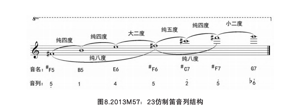 笔者对M521:14仿制笛演奏笛状态分为缓吹、平吹和急吹;对于2013M57:23仿制笛的演奏状态分为平吹、急吹与超吹。M521:14仿制笛由于管长较长,但管径并没有明显增大,骨笛的直径/长度比明显小于笛乐器正常比值,②因而仿制笛的低音区边棱音效应较弱,筒音及第1、2孔的发音均需缓吹才能奏出实际音高,但它的泛音列比较容易激发,通过两个笛孔的辅助调整可以较为流畅地奏出倍音列第1、2、3各泛音较为准确的音高。由于2013M57:23骨笛的管长相对适中,骨笛的直径/长度比例控制在理想范围内,其仿制笛在演奏中低音区较为轻松流畅。即使第3泛音及全开的高音需运用超吹技术才能获得,但演奏状态依然轻松流畅。与M521:14仿制笛相同的是,2013M57;23仿制笛演奏粗、细两端均保持一致的音列结构。2013M57:23仿制笛音列结构见图8。