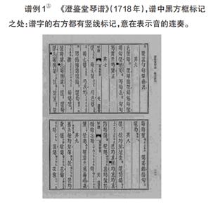 这种在减字谱旁划竖线标记音与音之间关系的做法,《枯木禅琴谱》中也有延用。然而,即使在几个音的组合中,每位弹奏者还可以选择不同的节奏安排,灵活性较大。