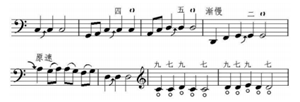 (Ⅱ)与出(V)做总体区分,也把左手指法编了主要的68个编号(见谱例6)。王光祈翻译琴谱的思维方式是希望用西方的音名等方式规范古琴的指法,但由于比较庞杂,琴人没人使用,所以没有广泛流传。