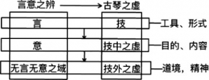 《淮南子·原道训》中深刻阐述:“故有生于无,实出于虚。”[48]此中,“有无”作为道家哲学之最高范畴,其“无”即“虚”,亦可解为虚空、虚无之概念,乃道家对宇宙起源所作之抽象诠释。有无二者之关系,实则微妙地映射出虚实之间的内在联系。此种哲学思想在古琴艺术之演绎与追求中得以深远传承,不仅成为古琴艺术表现的内在驱动力,更作为其气质、神韵追求之生命内核。古琴之“虚”虽然在表达与阐释上有层次之分,但无论是形而上的理念层面还是形而下的艺术表达层面,“虚”从来不是独立存在的,其与“实”这一组相对概念始终相生相成。单就乐本层面的古琴之“虚”而言,借庄子“言意观”对其进行审视,可分为“技”“技中之虚”两个层级,深刻体现了“虚”与“实”的相生相成。