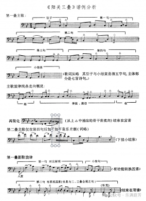 既是琴歌,分析时就还有个词曲结合问题。应该说《阳关三叠》的音乐基本是“声乐性旋律”,所以多数演唱、演奏者在音乐的处理方面(无论是旋法、分句,还是段落结构的扩充)都注意到与歌词的吟诵音韵、节奏基本一致,这也可算作是它的特点方面。但是,又由于该曲生成的过程很复杂(原来王维只有四句诗,即主歌主体部分的七言绝句诗,其他都是他人陆续填写、创作完成的),所以个别地方,还存在有词义不通之嫌(如主歌引子句的“清和节当春”与小结束句的“霜夜与霜晨”就一个写“春”一个写“秋”不在同一季节。为此,王震亚先生在改编此曲为合唱时,特将后一句词删略去了)。此外,也许还有个别词、曲分段或句逗不甚统一之处。如,从主歌的小结束看:第一叠应该结束在“霜夜与霜晨”——可是此句后并无句号,这在歌词划分段落时,就成了疑问(对比相应部位的第二叠结束在“无复相辅仁”;第三叠结束在“绿草遍如茵”,这两个五字句后面均有句号,作为第二、第三叠的主歌结束句显然是毫无疑问的),这或许也就是我文章一开始提到的,有同事将它视为“新段落开始”的原因——这种个别地方词曲结构不同步的情况,古今中外都有。我认为词、曲结构错落的现象并不影响音乐自身逻辑的分析,更不要简单地以词的结构逻辑来“代替”音乐自身结构的逻辑或段落的划分。