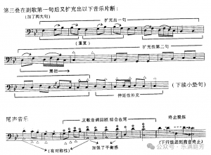 三叠的结构变化部位与二叠正好相反,它主要在副歌。(它的主歌除去在演奏技术上比一叠更为活跃以外,其结构大体与一叠相同,分析从略)。副歌的变化在三叠中可谓大矣!它十分集中地出现在表现感情激动,音乐跌宕起伏的第一基础大句之后,又加了两个较大的展衍扩充句(见谱例),它们几乎要把这一段落音乐扩张成一段相对独立的展开部。但是,终究由于音乐很快地又转入了原含再现性因素的第二基础大句,并且,如果仅将原第二大句音乐作为独立的“再现部”看,结构又显得不够规模,所以三叠从整体来看,还大体保留为一种二部性结构的架式。这里还有两点值得说明:一是三叠副歌的结构扩充带来了全曲的高潮;二是三叠副歌的扩充只是出现在副歌音乐的展开部位(即小垫句之前),而同时又牢牢“保留了”与一、二叠相互统一的第二基础大句(亦即一、二、三叠的“合尾句”),这对保持住原音乐的“基本轮廓”也起到了至关重要的作用。