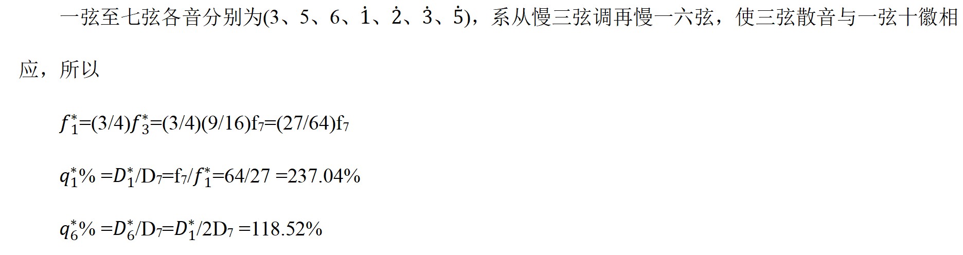 同理,二、三、六诸弦之相对百分比q%分别为208%、196%、115.8%。