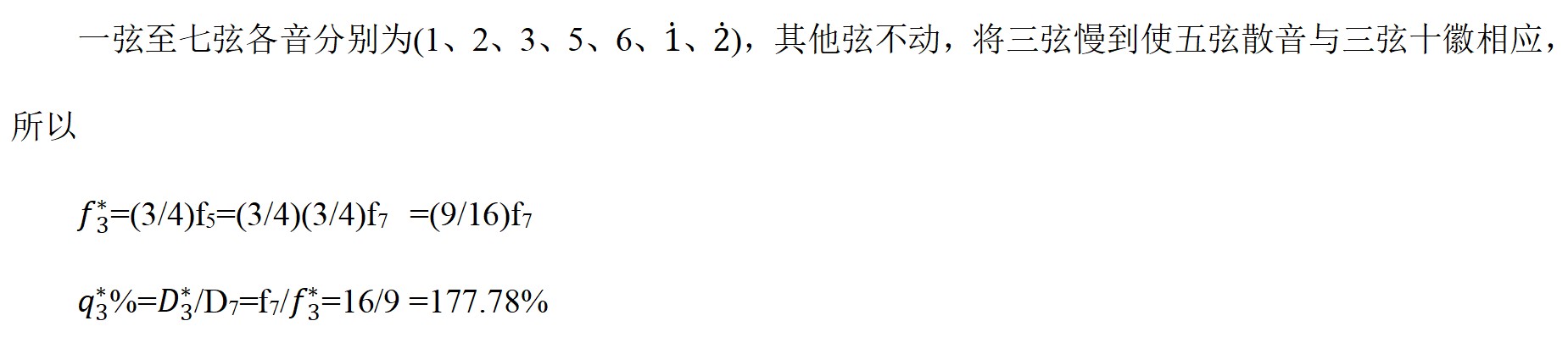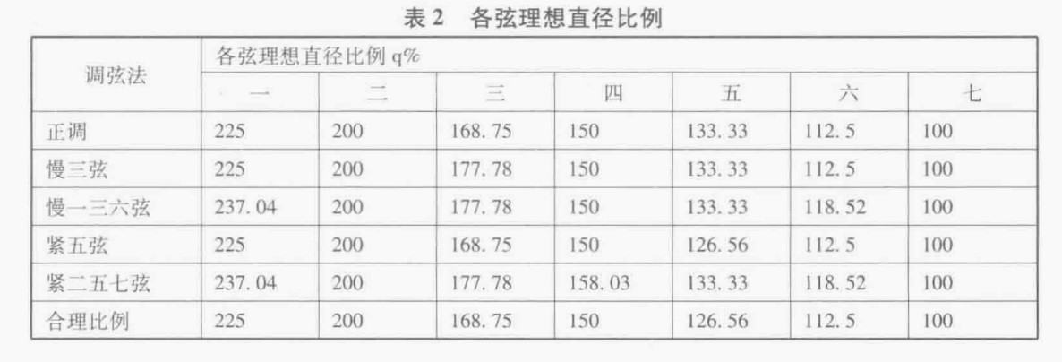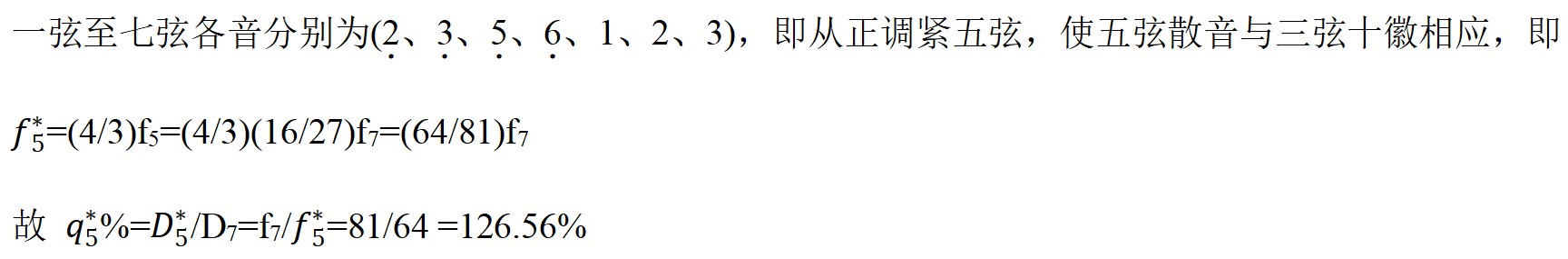 (二)根据公式⑧,可推出各弦直径长度之间的合理关系。古琴之调弦法最常用的有正调、慢三弦、慢一三六弦、紧五弦、紧二五七弦五种,现分别讨论如下
