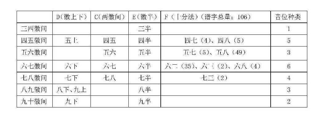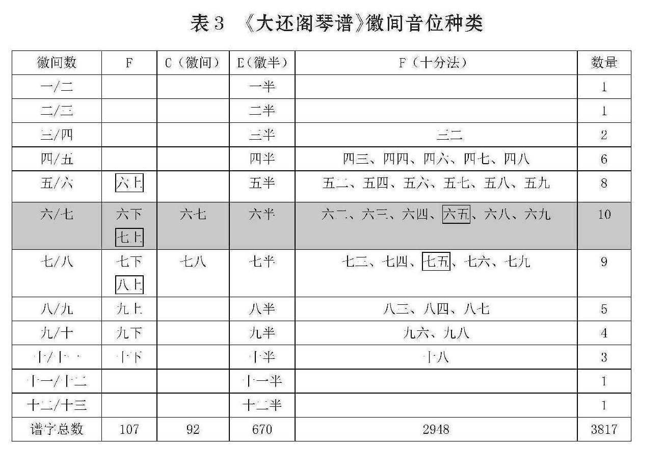 据笔者统计,《大还阁琴谱》中出现了三千多个“徽分”谱字。如此海量的实践,说明“徽分”记谱法已到达比较成熟的阶段,探索到的音位非常丰富,远超前人,其徽间音位种类情况(见表3)。