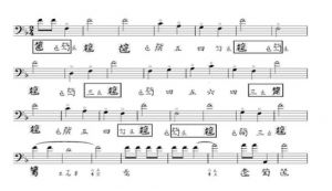 谱例中标有六个小黑框,每两个谱字一组,刚好构成隔八度的“同音相谐”,这里的“六二”使用很准确,完全符合旋律进行,徽分记谱准确。