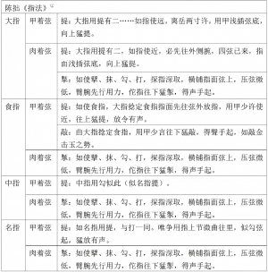 先来看右手基本指法的变迁。北魏陈仲儒《琴用指法》所录右手基本指法有“挑、勾、打、弹、癖、捻(拈)、摘、触、末”⑧九种,其中“挑”的演奏提示是指甲向上挑弦,食指、中指通用⑨;“勾”⑩是指腹向上勾弦,食、中、名三指通用⑪;“擘”是大指指腹着弦向外祐⑫;“弹”是弹指击弦⑬;“捻”是捻弦向上放令有声⑭。综上可知:其一,当时的指法着重规范下指动作,指法名称即下指动作对应的动词,体现了指法初创期名实相符的特征;其二,当时尚未形成指法分类意识。