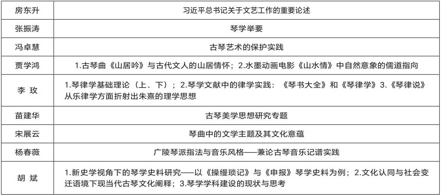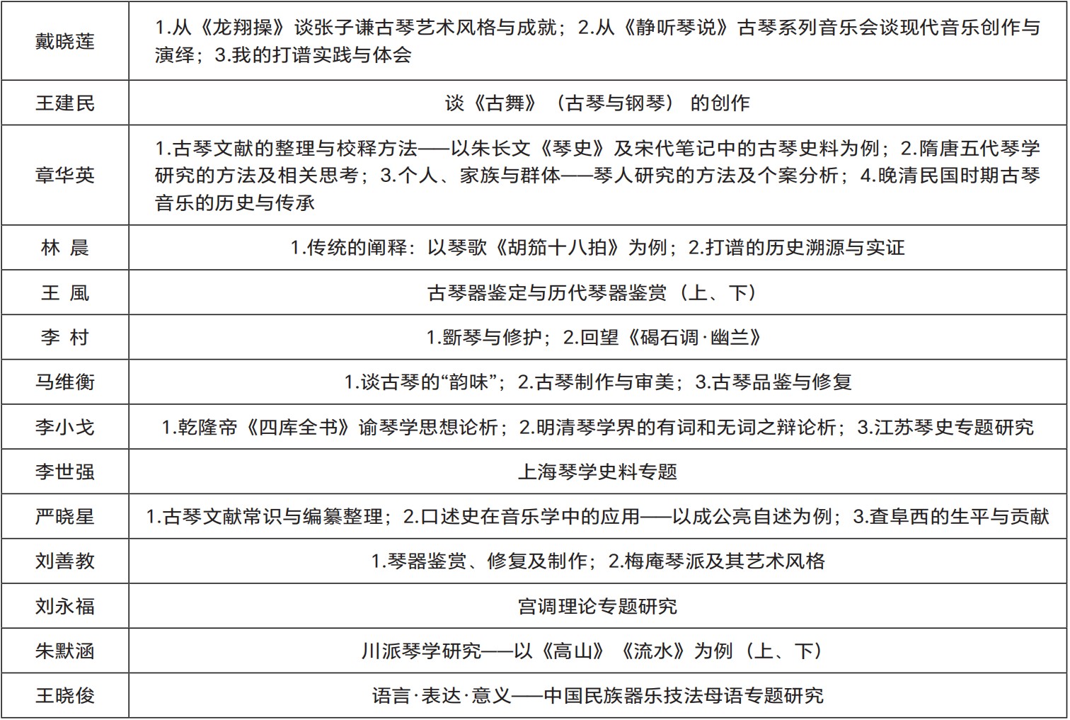 项目整体的培训课程以琴学理论评论为核心,涉及琴史、琴论、琴器、斫琴、琴人、琴派、美学、打谱、律调、演奏与教学、古琴与文学、古琴社团机构、古琴新创作、非遗语境下的古琴传承等相关内容,具体如下(按授课时间顺序):