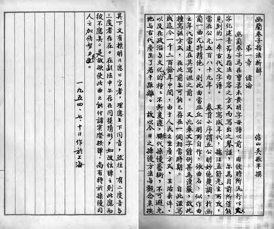 其演奏《幽兰》首二段已颇纯熟。惟至五度蠲时,渠仍用杨时百法,先移大指至十,然后再蠲,弟告以大指应于第一度按十二徽,然后每度逐步向上移少些,至末度,移至十徽,停住。弟检五八页第三行原文:“大指随蠲上至十”示之,渠表示同意与接受,而随即更正。又立孙兄未抵沪前,弟曾作了很小部分分析,发现谱内无单独使用中指向外出弦,与大指向内入弦之例,同时单独指法中以名指打与食指挑,出现次数最多(名指打共五十七次,食指挑共四十六次)。可见是时是以丁、为相对指法,等于现在用勹、相对也。原函弟已录出,兹亦附赵(上),对于研讨所得与弟发现各点,容整理后,再提供参考。[37]