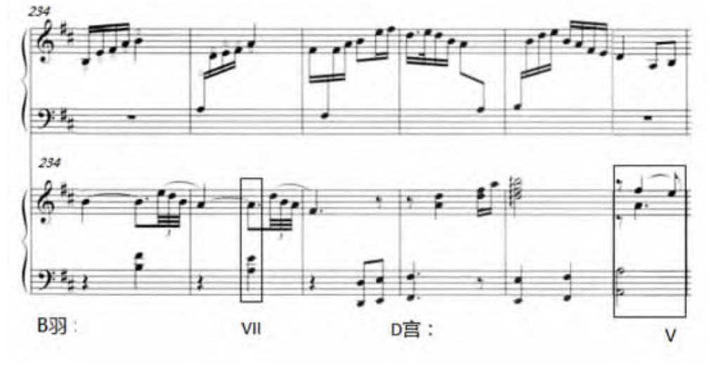 1.钢琴和声语言的中国化。如上所言,以这三部作品为代表的众多古筝协奏曲中皆用钢琴替代乐队协奏,故此作曲家需要从调式、和声,甚至节奏节拍及演奏技法等给予钢琴全面的民族化“改造”。如此不仅丰富了筝乐表达样式,在渲染作品意境与凸显民族风格方面也拓展了钢琴的表现空间。尤其是五声纵合化和声在钢琴声部的广泛使用,非三度叠置的中国式和声,包括省略或替代偏音、附加音和四、五度结构等,构建了具有鲜明中国民族特色的和声色彩,与筝乐演奏相得益彰。如《临安遗恨》慢板第235小节钢琴声部为B羽调式省略三音的VII和弦,至239小节为D宫省略三音的V和弦,营造出悠远且具有中国风格韵味的文化意境(见谱例1)。