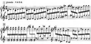 通常,在正拍上的重音俗称规则重音,与之相对应的,不规则重音则是通过使用一个或多个与常规节奏不同的重拍来制造冲突。因此,不规则重音成为赋予演奏变化的重要手段之一。此曲中运用了大量不规则重音的变化。在谱例2中,看起来似乎都是十六分音符的演奏,平平无奇,然而,这些重音在分布上呈现出不同的规律和特点,既有仅在某些音符上单独出现的正拍重音,如第33小节的第一拍,也有仅在某些节奏上单独或多次连续出现的反拍重音,如第33小节第二、三拍等,这些巧妙运用不规则重音的方法,不仅防止了在听觉上产生过多相同节奏的重复和单调声音效果,而且增强了声部音响效果的层次丰富性。