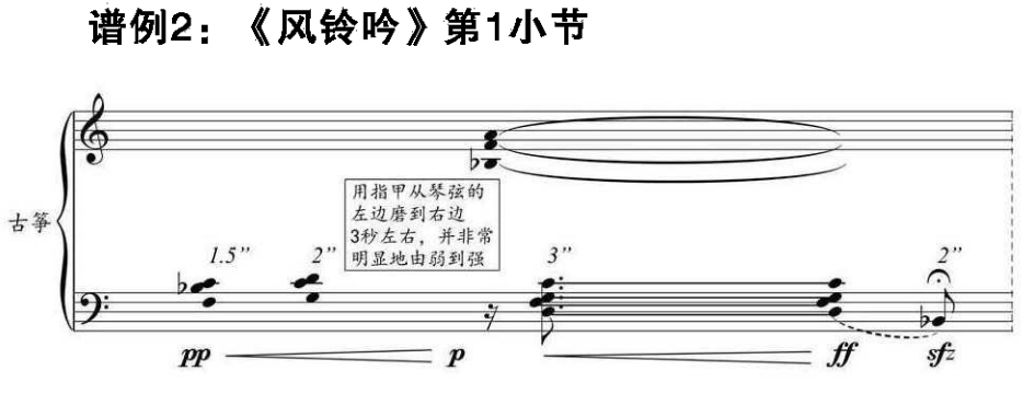 《风铃吟》采用特殊的定弦方式,体现了其独特的现代音乐风格和深厚的传统根基(见谱例1)。