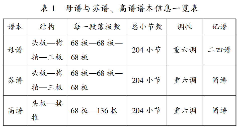由表1可知,母谱与苏谱、高谱在总小节数均为204小节,但在全曲的段数结构安排上有所不同。苏谱和母谱结构相同,均由“头板+拷拍+三板”连缀而成,每曲68板,有“曲变三速”的特点,高谱中只有头板,没有拷拍和三板,而是使用“接推”,即用头板的旋律进行变奏。母谱与苏谱、高谱调性均为重六调式。记谱方式上,母谱采取二四谱记谱,高谱、苏谱采取简谱记谱。从乐谱来源上看,高百坚、苏巧筝两人皆在前人传谱的基础上进行了自己的整理,可以看作是对前人成果的发展性继承。