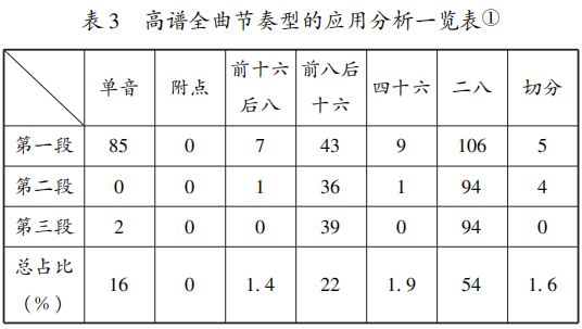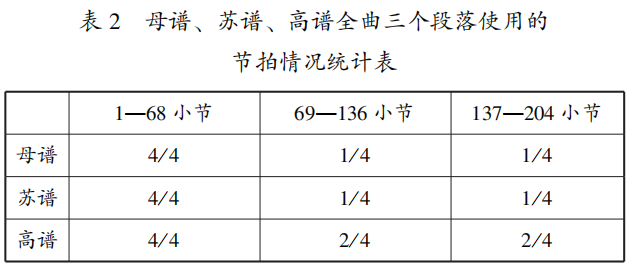 从表2可看出,母谱与苏谱的节拍布局一致,均为4/4、1/4、1/4拍。高谱更多表现出差异性,将后两段改为2/4拍。苏谱与高谱展现出不同节拍布局,笔者认为这应该是不同流派传承的结果,两个流派虽同出一源但其对乐曲的理解各不相同,这样的差异性是流派在传承中找寻自身特点的外在显现。