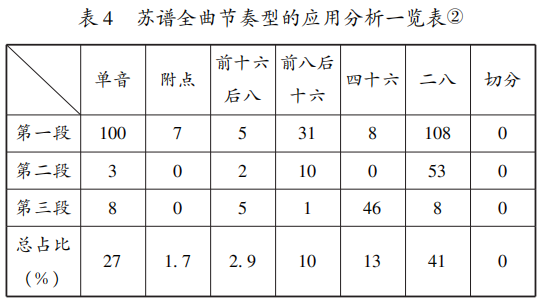 潮州筝曲《寒鸦戏水》高谱与苏谱均在母谱的基础之上做了加花变化。笔者以四分音符为一拍,梳理出高谱与苏谱中出现的七种节奏型,包括单音、二八、前八后十六、前十六后八、四个十六分音符、附点、切分。笔者将对这七种节奏型在高谱与苏谱中的使用次数及占比情况进行梳理分析,如表3和表4所示。