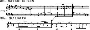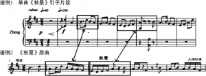同时要说明的一点是,《秋景》的创作不是简单的移植,也不是把古筝作为伴奏乐器重新运用到曲艺作品的伴奏当中去,而是借用曲艺作品的旋律为动机和音乐材料,以古筝独奏为方式创作出的主题变奏三段体古筝独奏曲。它具有一定的创新价值,对于今后借鉴曲艺这一传统艺术形式与古筝演奏结合,创作出更多具有地方特色的古筝曲目,有一定的奠基意义。