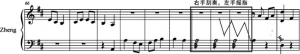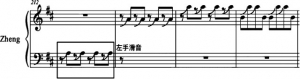 需要着重说明的是:四胡作为天津时调的伴奏乐器,对天津时调音乐风格的形成有着非常重要的影响作用。所以古筝对于四胡音色的模仿,意在突显天津时调的音乐风格。此处在按弦的力度上应注重手腕和手指的配合,下按时应增加腕力,贴弦上提时应适当放松腕力,依靠指力的作用,同时,在音高控制方面需要配合听力,保持好音准,并确保声音的连贯性,模仿四胡拉弦滑音营造出的连贯效果。