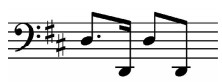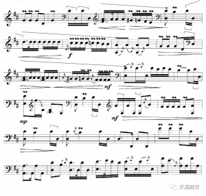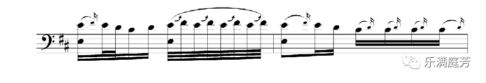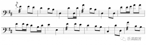 2)借鉴三弦的“粗质”颗粒感三弦的“粗质”颗粒体现在其无音孔的双面蒙皮共鸣腔所发出的音质上,弹奏时双革面的充分振动能获得浑厚有力的音响,尤其是共鸣极好的低音区极具个性的革制特殊音色,明显区别于其他两件纯木制共鸣腔体的乐器,因此,为了更好地发挥这一音色特征,三弦往往在旋律核心音上,作八分音符或四分音符的八度下行跳进,如