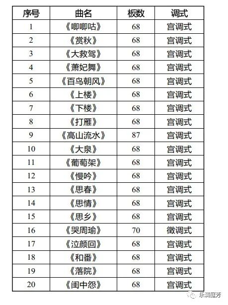 顺着从板头曲筝乐声部中脱离的河南筝曲的线脉,河南筝曲的曲体结构为何是定格的68板这一问题迎刃而解,这是因为该结构力的来源即民间母体板头曲的结构原则——来自器乐曲牌【八板】的定格68板结构体式。以下即对曹东扶传谱的20首典型河南筝曲的板数与调式进行了统计: