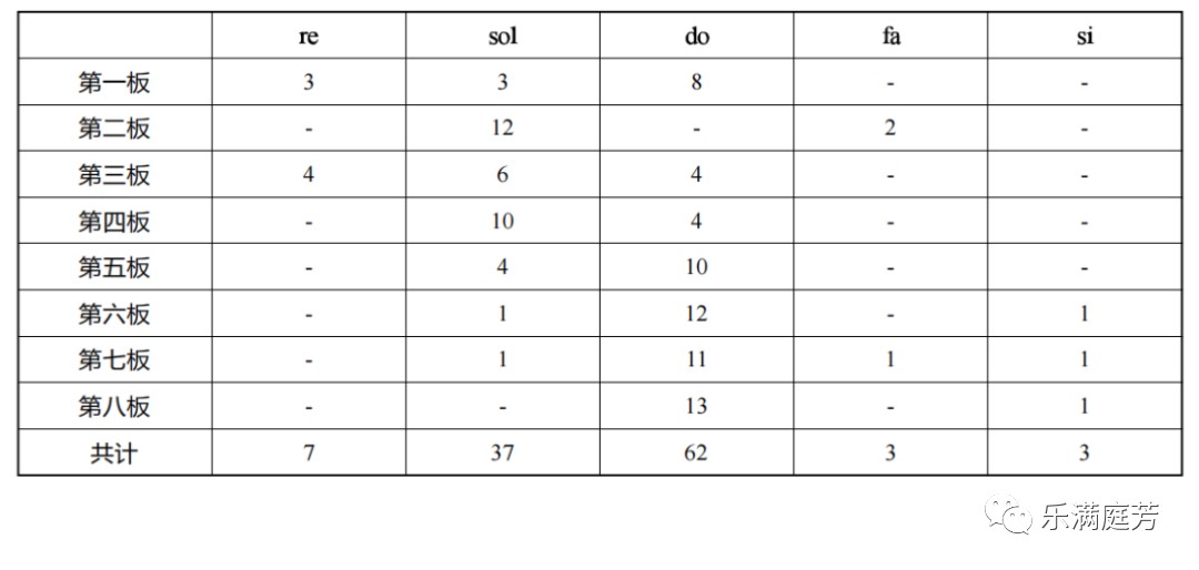 然而,固定搭尾的手法并非仅仅在乐句停顿处使用,它还深入地渗透到每一处细小的乐节之中。以河南筝曲《高山流水》为例,以下为乐曲每一乐节呼吸处固定搭尾的统计: