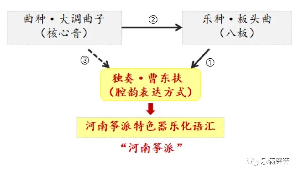 如图所示,从民间曲种到民间乐种,再到独奏艺术流派的形成,不仅仅是“从方言到器乐语汇的升华”在起作用,而是综合提炼了来自原生民间母体中,具有独特意味的民间音乐表演、欣赏、创作中的理性成分。笔者认为,河南筝派及其特色器乐化语汇的形成,综合了图上三者的特性及优点,其中任何一部分都在民间历经了千锤百炼,为河南筝曲的形成与发展打下了稳固的基础,并提供了独具个性的表达方式:来自板头曲的八板结构体制与旋律形态奠定了河南筝曲最初完整的基本结构形态;来自大调曲子以“宫、商、徵” 为核心音的四五度旋律框架赋予了河南筝曲深层的地域性旋律架构逻辑;来自唱腔叙事中河南方言音调及语气情态的描摹为河南筝曲特色器乐化语汇的滋长提供了个性创造的空间等等。应该说,曹东扶对河南筝曲中每一个乐音的音色音响、句法结构、板式速度、旋律框架、润腔技法等等,都是他审慎揣摩与择取的结果,他所提炼这些基本程式,可以说成为了河南筝派表述与演奏的基本原则,也是在近半个世纪的河南民间唱奏艺术经验之上,进行整体总结与再创造的结果,河南筝正是在曹东扶的手中,完成了从综合性原生民间音乐母体向“纯音乐”器乐独奏体裁的飞跃,完成了从民间群体约成性创作向个体器乐独奏艺术流派的飞跃。