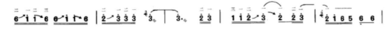 本段演奏需重点关注的是左手弹奏与作韵转换的连贯性和准确性,以及左右手之间的配合,音乐旋律取材自民间歌谣,左手按滑音、颤音、揉弦的加入对于塑造音乐的韵味而言非常重要,学生可以通过欣赏、揣摩江西地区的采茶歌以及当地方言的音调特点继续思考如何在演奏中更好地展现音乐韵味。