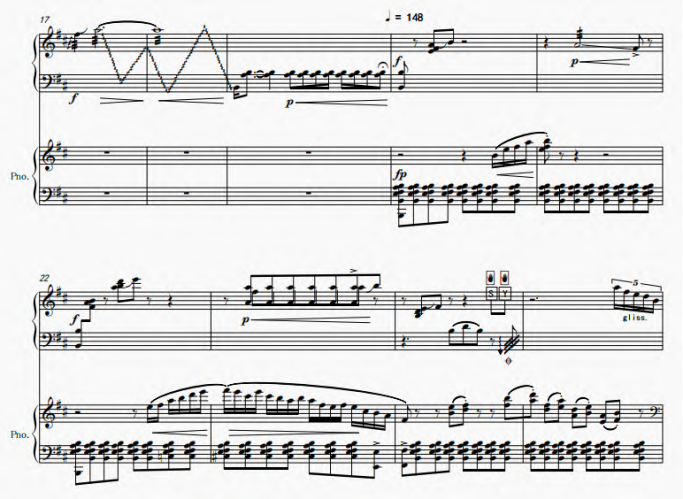 其一,作曲家们不约而同地将中国传统文化元素作为主题,从作品的灵魂中体现出“民族性”。比如作曲家方岽清的代表作《墨客》《冬虫·夏草》《禅宗三境》等,从作曲的手段来看,如同对西方弦乐创作的技巧一样,延用了类似于弓弦乐器的音乐律动来刻画。同时利用古筝弹拨乐器的演奏特性,通过干净快速的演奏,营造出更为接近键盘乐器织体的特点,产生了大量的展示快速技巧的华彩乐段。技术性和艺术性完美的嫁接,以西洋乐作曲方法来呈现的作品更加丰富多元,音乐主体的选择和作曲方式的多元化是方岽清、陈哲、王丹红等青年作曲家共同的特点,学院派的教育背景和对古筝艺术产生的浓厚兴趣驱动他们在作品的创作方式和主体选择之间找到更为恰切的结合点。