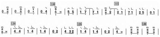 浙江筝派的按音幅度较小、频率较快,与北方筝派的粗犷按弦对比更显细腻。如在演奏«高山流水»时,运用按音技术模拟流水波动(见谱例5)[6]48。