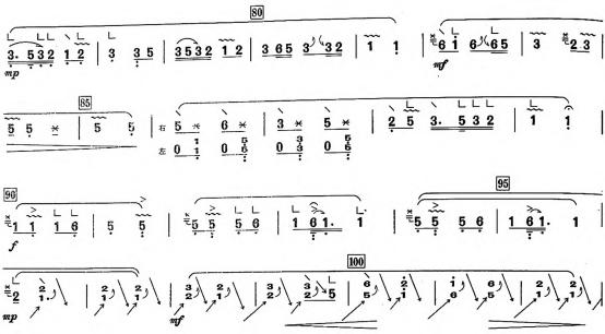 “游摇”是河南筝曲中常用的技巧之一,右手在筝弦上游走弹奏,同时左手进行“慢滑急颤”,以求得更为丰富的音色变化和营造夸张的戏剧性音响效果。