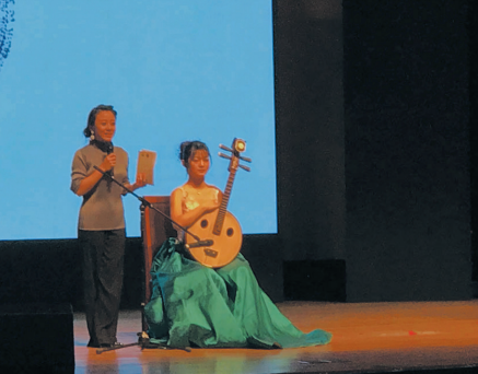 讲座音乐会最大的优点在于灵活性,教学节奏畅快自由,可以边讲边演奏,给人以直观生动的感受。讲解方面,主要讲授柳琴、中阮的历史源流、发展变迁、指法技巧、乐器性能等内容;演奏方面,我选择了柳琴、中阮代表性的经典曲目。这一形式既落实了学生对柳琴、中阮历史、技法的掌握,又保证了学生对柳琴、中阮乐器特性、音乐作品的理解。同时,在边讲边演的过程中,还可以产生一系列的问答、示范演奏等互动环节,让学生沉浸式体验柳琴、中阮的音乐魅力。