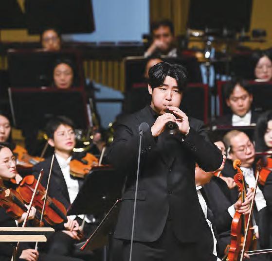 在“艺苑撷英”—2025全国优秀青年音乐(中国民族管乐)演奏人才展演音乐会(以下简称“音乐会”)上,青年人才的演奏与选曲就体现着向经典和传统的致敬与创新,并寻求传统音韵与现代手法的对话与融合。武汉音乐学院张莹莹演奏的竹笛协奏曲《后羿》(王子鸣曲)用竹笛表现古老传说中的神话人物,将乐器特色融入作品题材与内容。她的演奏音色清亮悠长,音乐表达流畅自然,在与交响乐队默契配合的气韵流转间重塑英雄史诗的听觉维度,水准斐然。上海音乐学院刘雯雯演奏的唢呐协奏曲《大开门》(徐坚强曲)从传统民间曲牌中取材,却寓意改革开放的时代内涵,在创作中富含新意、深意,她的演奏以细腻多变的音色控制挖掘唢呐表达潜能,融合北方刚劲与南方灵秀,使传统意蕴焕发新意,现代作品诠释更见个人创新表达。天津音乐学院李乐演奏的竹笛协奏曲《陌上花开》(郝维亚曲)是将传统旋律与现代手法巧妙结合的一首作品。他的演奏以稳定的气息支撑起丰富的音色与音乐层次,在复杂的节奏中把握精准,情感表达深沉而不失灵动,展现出竹笛演奏“刚柔并济”美学特质。中央音乐学院冯天石演奏的《幽兰逢春》(赵松庭、曹星曲,李滨扬改编)是当代竹笛艺术的经典曲目,她的处理细腻婉转,慢板旋律情感丰沛,快板段落颗粒清晰,体现了专业音乐院校教育体系下的规范与创新。