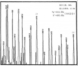 当第90号钟在频率上限设为12.8kHz(分辨率32Hz)的谱图中,就可明显看到上谐音列的前二项音的峰值(见图6中之上1、上2)。
