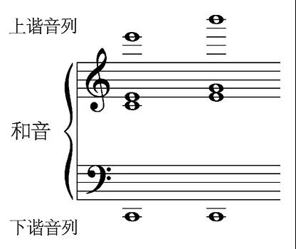 作者在有关结合音的研究中发现,由多谐振动形成的乐音之间的结合,不同于纯音之间的结合。前者的结合,将会由原二列谐音列的所有谐音之间的差拍而产生的第三谐音列和第四谐音列的基音,它们均为自成一谐音系列的首项音。高于和声基音的命之谓“上谐音列”,低于和声基音的命之谓“下谐音列”。