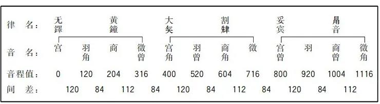 依照四种音阶结构关系组成的十二律,完全不同于三分损益十二律(见表4)。从相邻律来看,小半音为84音分;大半音有两种结构形式,一为120音分,一为112音分。十二律的音列,又可分为三块结构相同的、可以循环的单元。