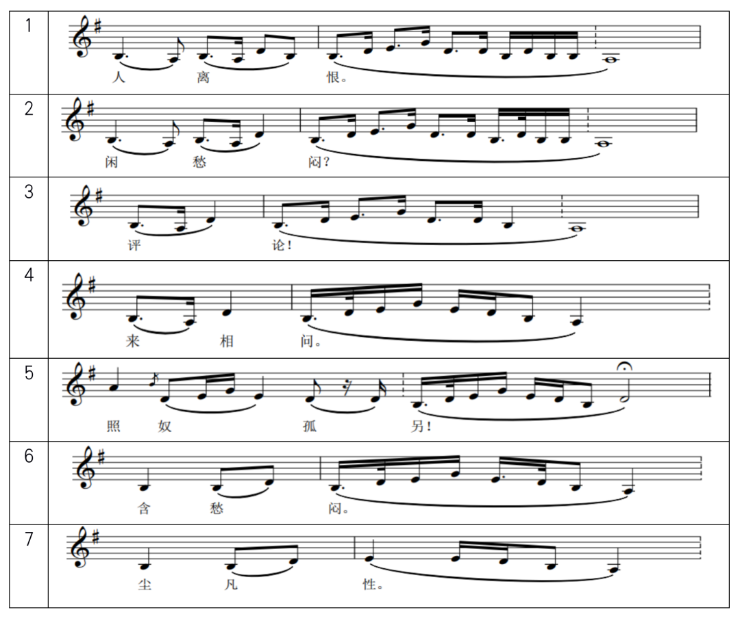 对原本昆曲唱腔中一些可以奠定音乐统一风格的特征性旋法或片段性旋律的保持与强调是作曲家与演奏者在保持音乐主体性上走出的重要一步。演奏家将原本昆曲唱腔中的特性音列在曲笛声部加以强调,并由琵琶、二胡等其它乐器在其声部以支声复调形式再次加以强调。在作品《朝元歌》中,原本《玉簪记·琴挑》所唱数支【朝元歌】中数次出现(谱例1)的角音至羽音的音阶上行与徵音至商音的音阶下行构成了一组特性音列,在作品中以支声复调的形式强调。值得注意的是,这种相似度与出现频率均较高的音列带有对曲牌的超脱性,这一五声音阶羽调式的音列在昆曲《牡丹亭·惊梦》商调【山坡羊】、《牡丹亭·寻梦》仙吕入双调【忒忒令】、《琵琶记·描容》南吕宫【三仙桥】、《红梨记·访素》正宫【普天乐】等大量曲牌中均有出现,只是存在音高的移位。一定程度上,音乐会中脱离了文辞的昆曲唱腔音乐通过对超脱曲牌本身音乐材料的强调性使用表现了一种含蓄的纯音乐情绪。不同于现代前卫性音乐创作中对腔化的微分性旋律的开发,“水磨行腔”音乐会中的独立音腔自始至终地在流动过程中发生着细腻的变化,并保持着一种民间性的情趣。